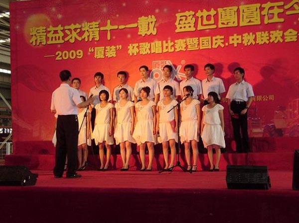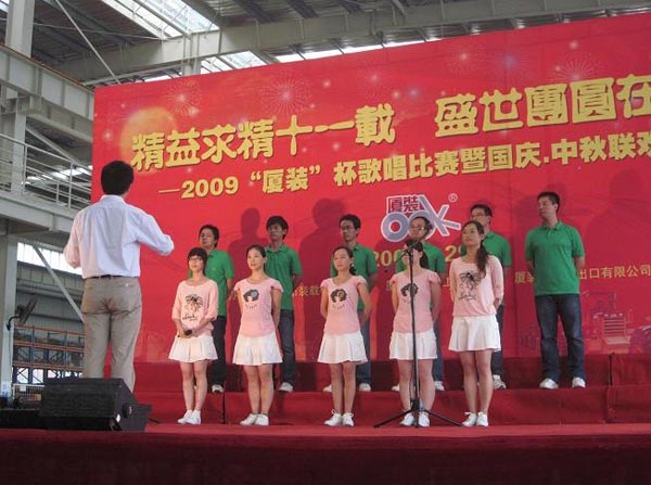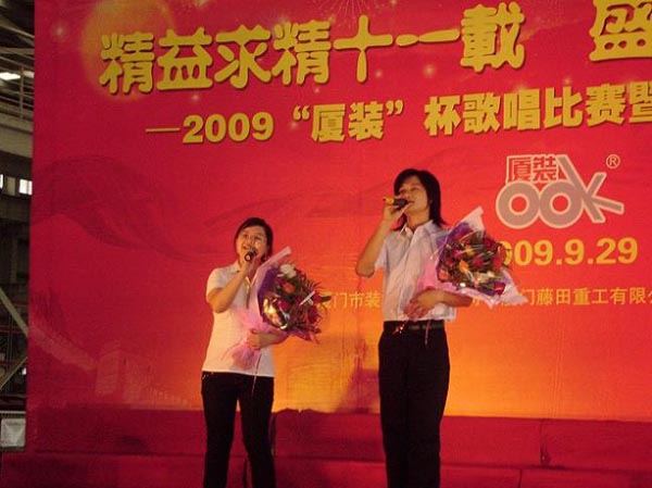 9月29日下午,2009年度“廈裝杯”歌唱比賽在廈裝公司總裝車間舉行。此次歌唱比賽以“精益求精十一載、盛世團圓在今朝”為主題,賀祖國60周年華誕、喜迎中秋、慶祝廈裝成立11周年。公司及各部門從6月份開始籌備此次比賽,此次比賽分為集體組和個人組,集體組(合唱)以部門為單位,最終有6支隊進入當(dāng)天的決賽,個人組通過先前的部門推薦及預(yù)賽選拔,最終有11人闖入決賽。